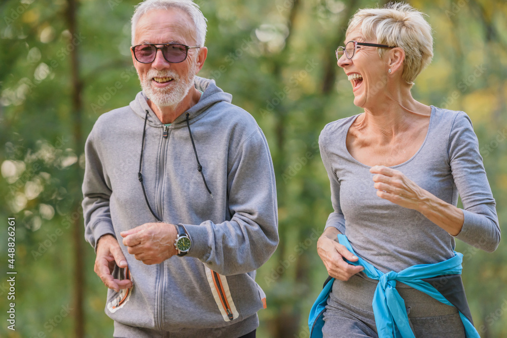 Smiling senior couple jogging in the park. Sports activities for elderly people.