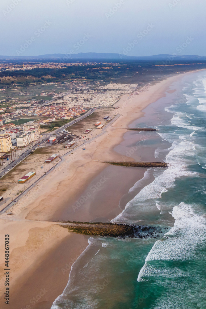 Aerial view of Costa da Caparica landscape at sunset in Setubal, Portugal