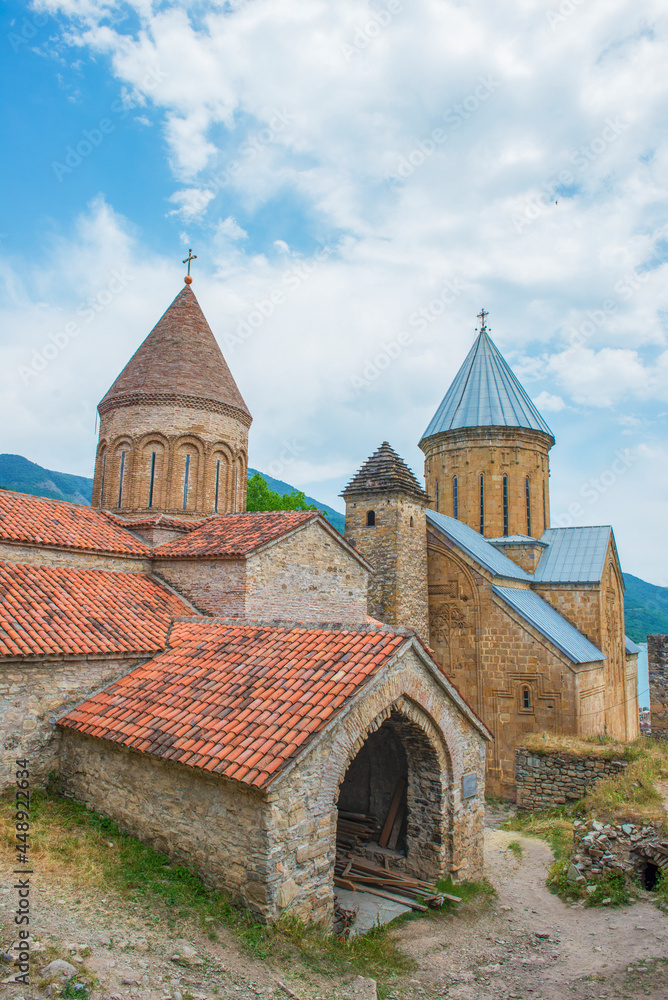 Georgia. Ananuri fortress. Stone walls. Clay tile. Mountain Lake.