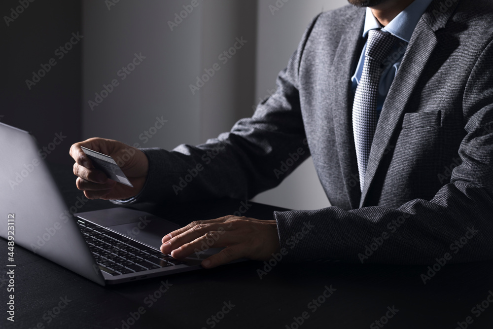Close up of young businessman holding credit card and using laptop computer on dark background. Online shopping concept.