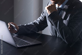 Close up of young businessman holding credit card and using laptop computer on dark background. Online shopping concept.
