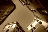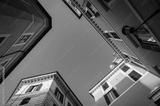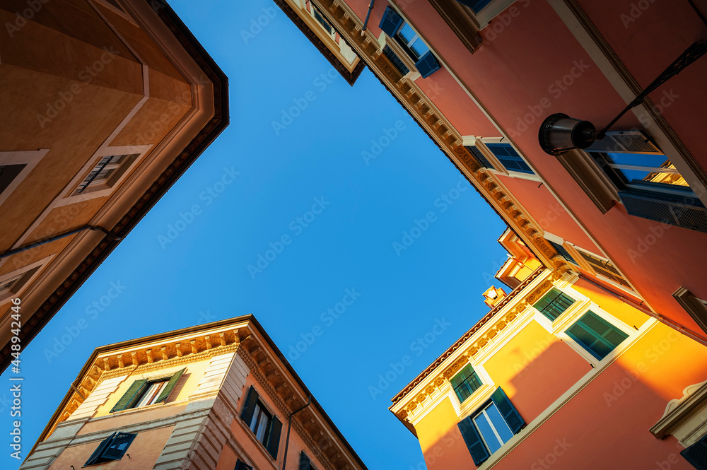 Low angle shot of old buildings in pastel colours and blue sky on Pastini street (Via dei Pastini) in historic centre of Rome, Italy