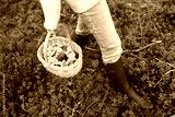 picking season and leisure people concept - young woman with mushrooms in wicker basket walking in forest