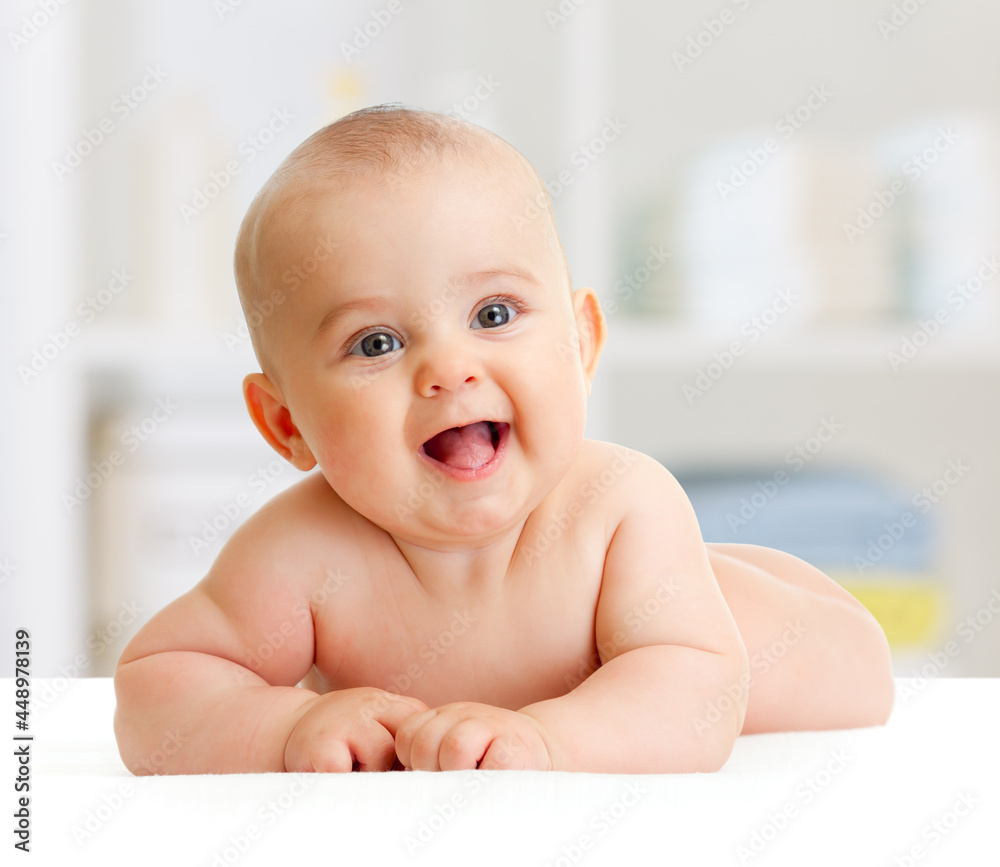 Adorable baby boy lying in bedroom