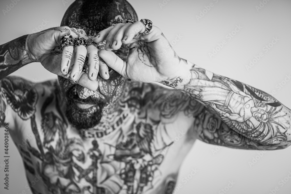 Grayscale shot of a cool Caucasian man with his whole body and face covered with tattoos