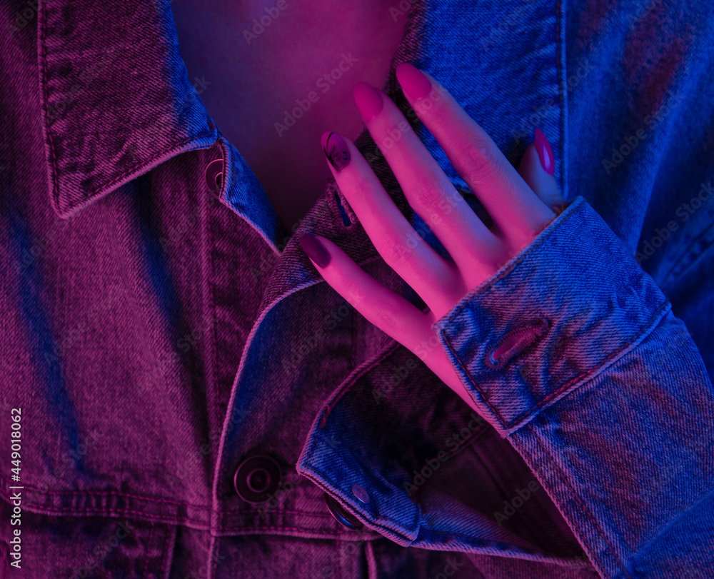 Retrowave style portrait of woman and bright manicure in neon light.