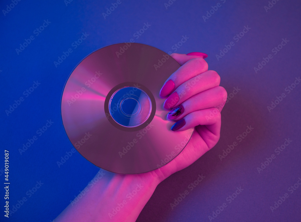 Compact disc in purple neon light and female hand with retrowave manicure.