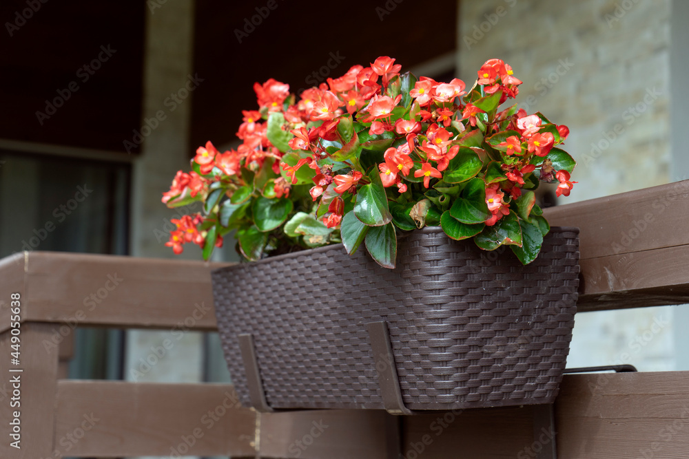 Beautiful bright red begonia flowers in the pot on the home terrace