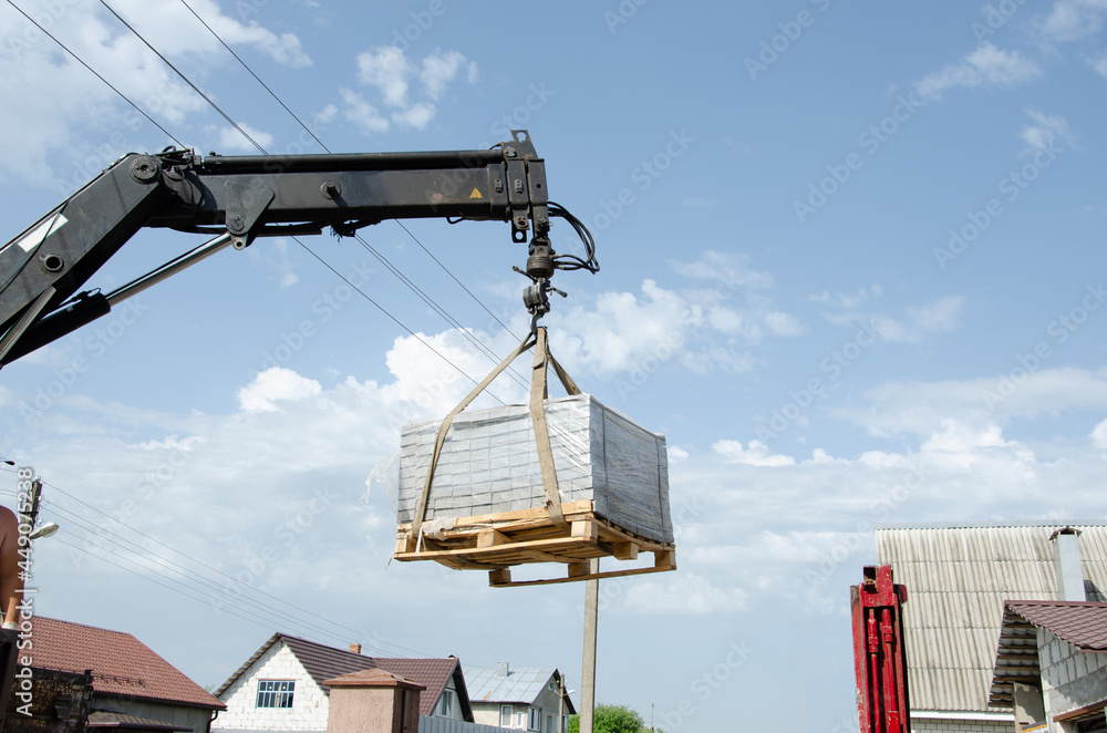 A man of a European race helps with loading tiles to the ground from a car. Delivery and unloading of building materials to the house. Truck crane unloaded street tiles.