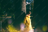 Cute young woman in a yellow jacket and hat melancholy walking in the autumn park