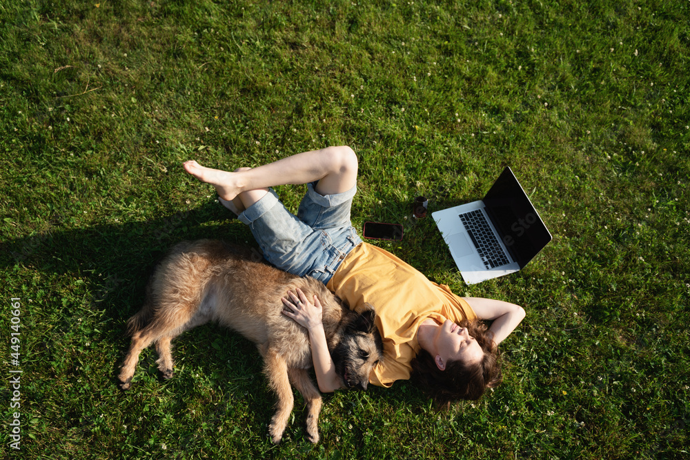 Beautiful happy young woman lying on the grass with laptop and dog, top shot