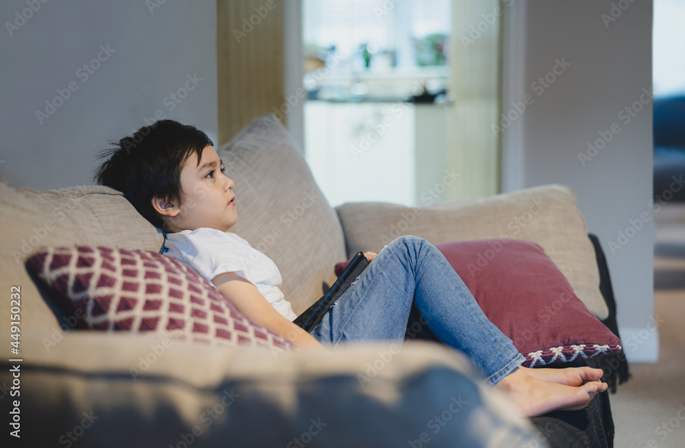 Happy boy lying on sofa watching cartoon, School Kid sitting alone on couch holding remote control and watching TV, Child relaxing in living room after back from school.