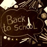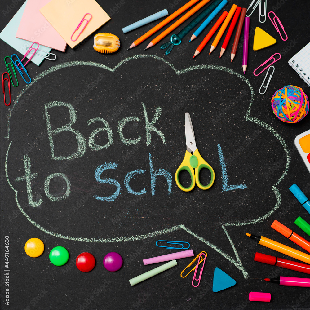 School multi-colored supplies, pencils and a drawn cloud with copy space for text.