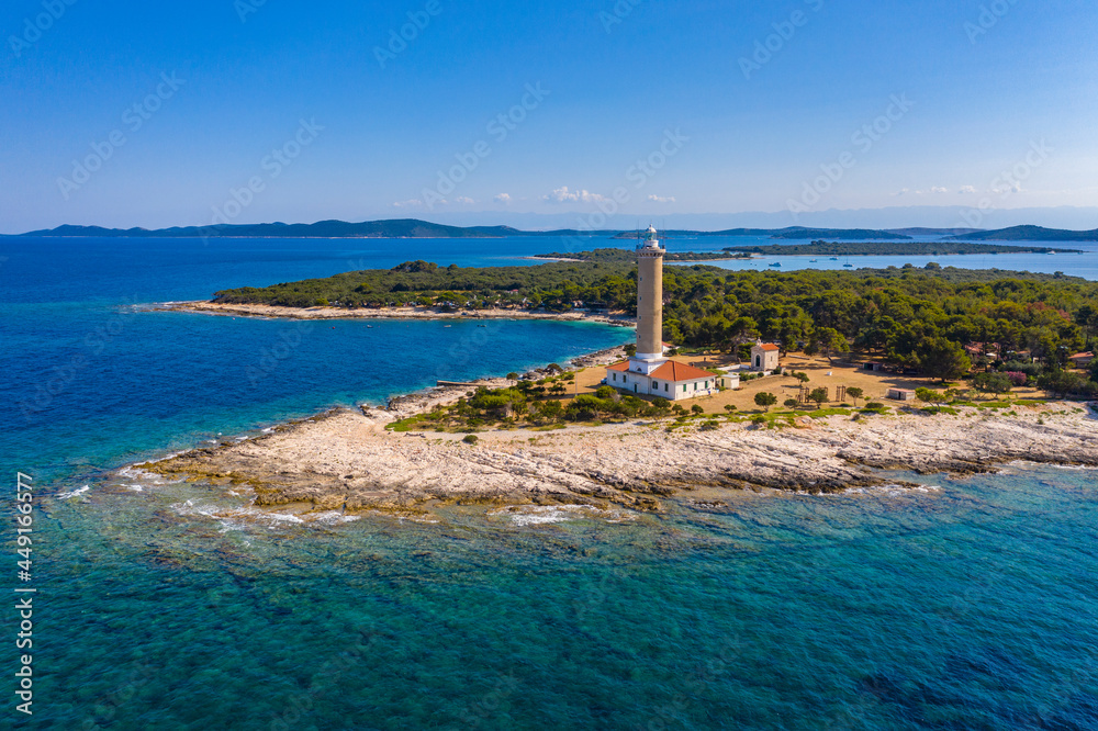 Aerial view of the old lighthouse of Veli Rat on the island of Dugi Otok, Croatia, beautiful seascape