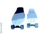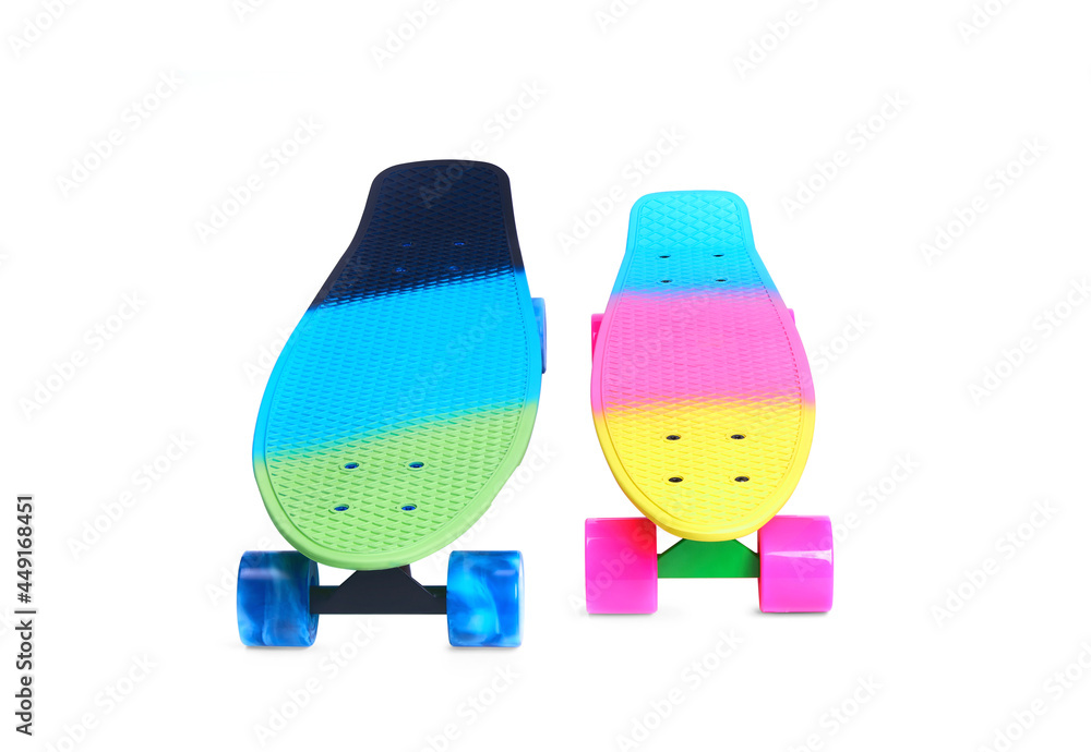 Two neon rainbow colored Penny board skateboards isolated on white background. Plastic mini cruiser. Youth minimalistic Sport inspired summer fun concept. Copy space.