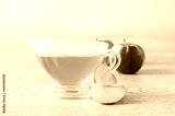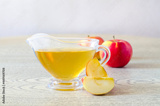 Apple cider vinegar in a glass gravy boat on a light background with red apples. Malic acid is beneficial for health and is used in cooking