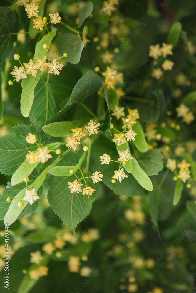Linden tree flowers clusters (tilia cordata, europea, small-leaved lime, littleleaf linden bloom) Pharmacy, apothecary, natural medicine, healing herbal tea, aromatherapy. Spring background.