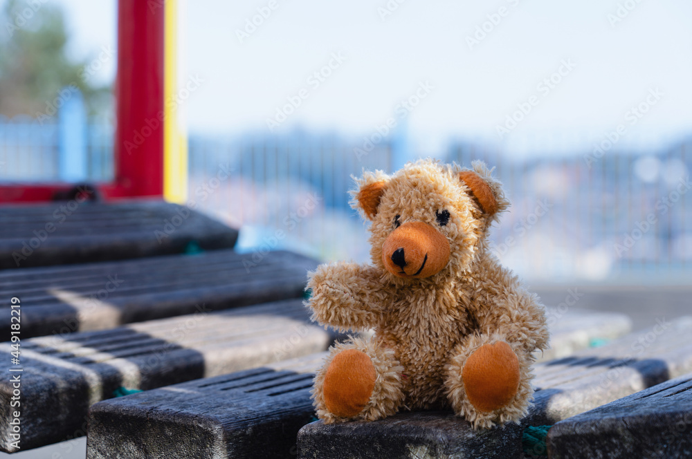 Happy teddy bear sitting on playground at public park in Sunny day Spring, High key light Brown bear sitting outdoor with blurry morning light bokeh background on Summer.