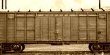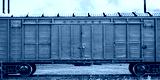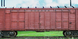 Large container on a railway platform in daylight. Freight train on railway tracks.