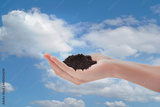 hand holds soil against sky background, palms are full of land, concept of farm, agriculture, growing organic products, seasonal gardening