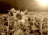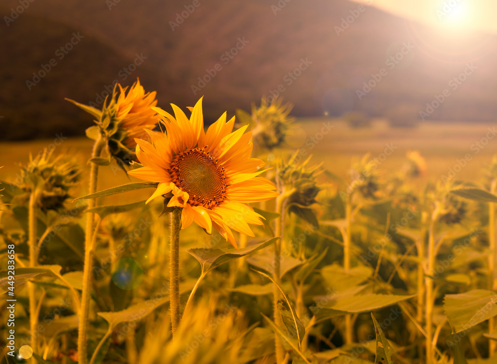 Sunflowers bloom in a sunflower field in the light of sunset.