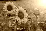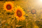 Sunflowers bloom in a sunflower field in the light of sunset.