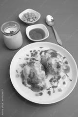 Dahi Bhalla or Dahi Vada is a type of chaat dish from India. It is prepared by soaking urad dal vadas in creamy yogurt with green and red chutney. Tri color dish. Indian Tiranga Flag colors food.