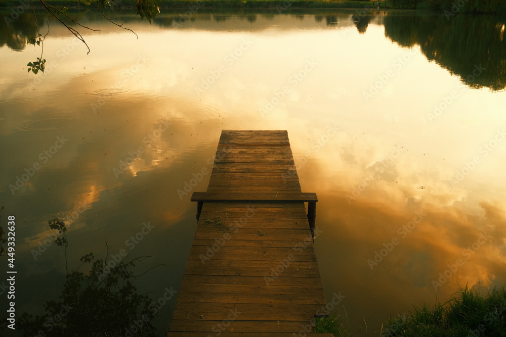 Steg am See zur Abendsonne mit Spiegelung der Wolken