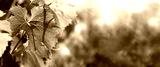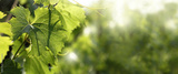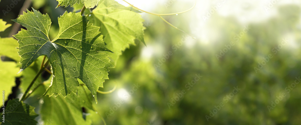 grape leaves with drops after rain. summer landscape with vineyard
