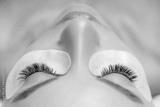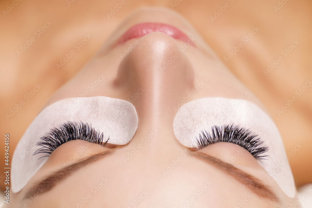 Eyelash Extension Procedure. Woman Eye with Long Eyelashes. Close up, selective focus.