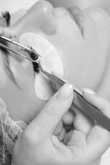Eyelash Extension Procedure. Woman Eye with Long Eyelashes. Close up, selective focus.