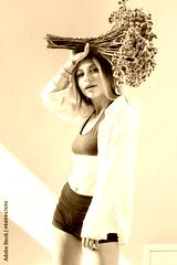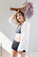 Portrait of a beautiful young girl in white shirt, black top and shorts, holding a big bouquet of dried flowers over gray background splashed by lines of light