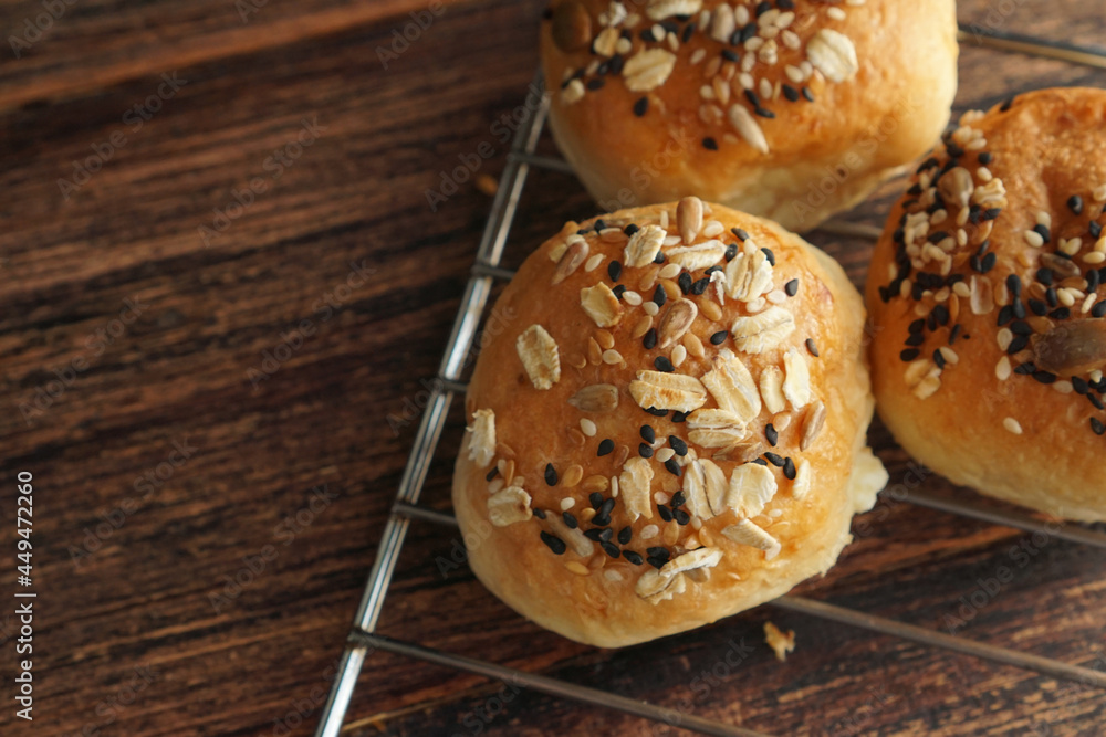 Homemade soft bread mixed with coarse wheat, cheese and a sprinkling of mix seeds and muesli