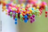 Foam polystyrene round bright colorful beads are reflected on a surface of a glass, mirror. Multicolored pearls floating down, hanging in the air. Foam spherical background. Celebration, fun concept.