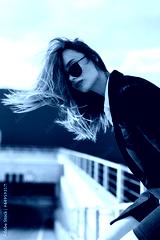 Fashion model beautiful young girl in dark vintage sunglasses in black stylish blazer in summer windy sunny day outdoors. Beauty urban lady poses on street at sunset.