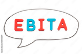 Alphabet letter with word EBITA (abbreviation of earnings before interest, taxes and amortization) in black line hand drawing as bubble speech on white board background
