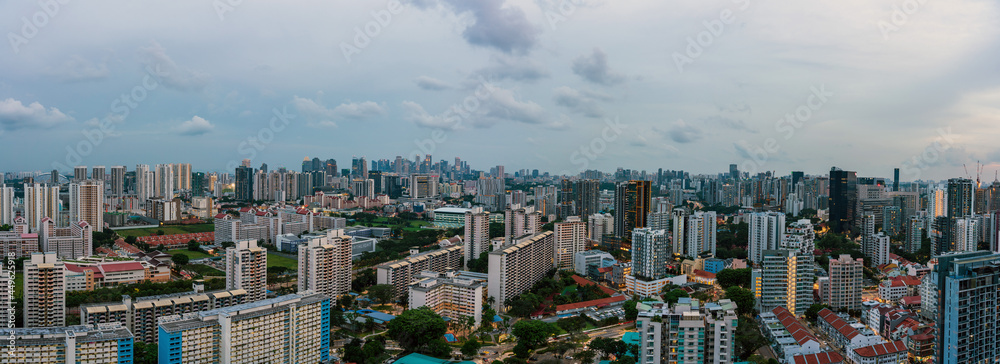 Ultra wide panorama image of Singapore Cityscapes on a cloudy day.