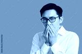 sick asian glasses male adult cold and flu symptom hand close mouth shut with stressful and tension white background health ideas concept