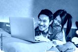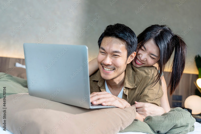 asian adult lover marry couple enjoy watching horror online movie from laptop or tablet in blanket on bed at home,home quarantine isolation lifetyle