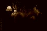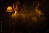 Long exposure of ballerina, dancers in movement in tutu with light on a black background. Both arms and a leg lifted up.