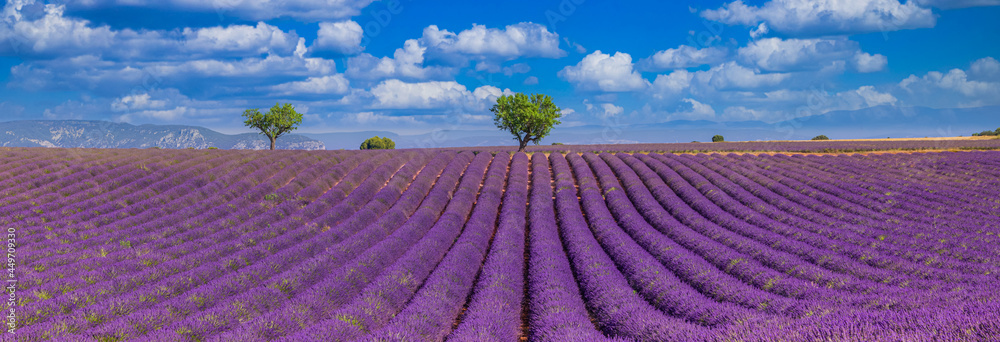 Nature landscape view. Wonderful scenery, amazing summer landscape of blooming lavender flowers, peaceful sunny scenic, agriculture. Beautiful nature inspiration background. France Provence, Valensole
