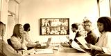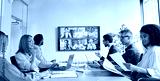 Diverse company employees having online business conference video call on tv screen monitor in board meeting room. Videoconference presentation, global virtual group corporate training concept.