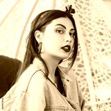 Portrait of a beautiful young girl with red pretty sexy lips with a fashionable bandana in a stylish blue denim jacket in a cafe outdoors.