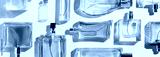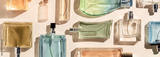 perfume bottles. a lot of transparent multicolored glass bottles of cosmetics, on a beige background. art composition flat lay panoramic