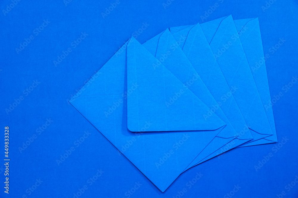 Stack of blue envelopes on blue background.