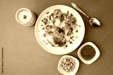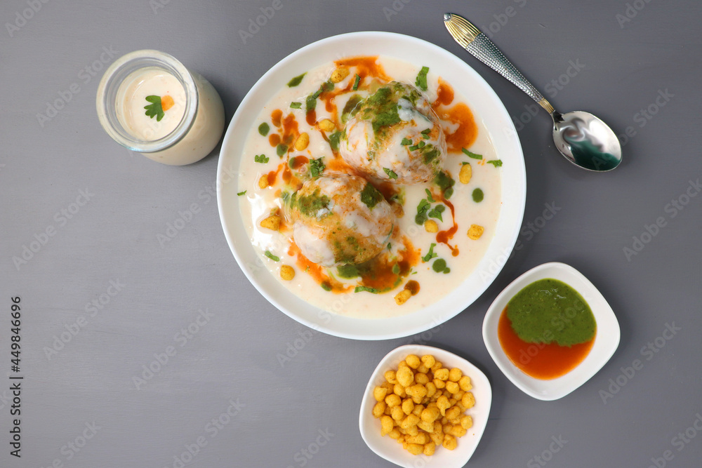 Dahi Bhalla or Dahi Vada is a type of chaat dish from India. It is prepared by soaking urad dal vadas in creamy yogurt with green and red chutney. Tri color dish. Indian Tiranga Flag colors food.