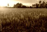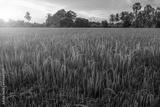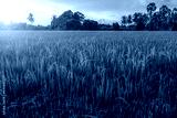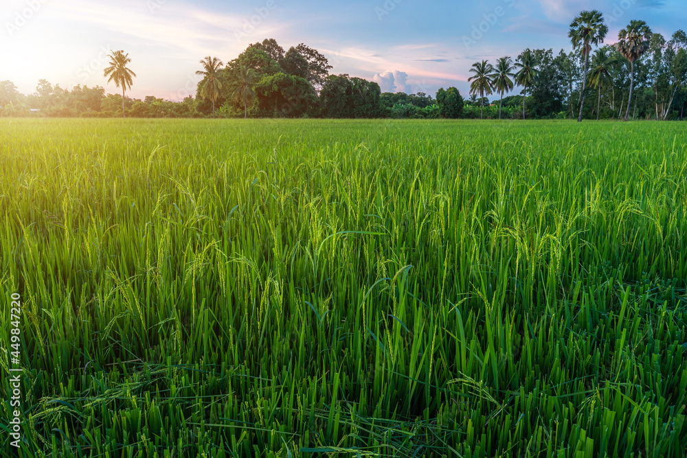 Scenic view landscape of Rice field green grass with field cornfield or in Asia country agriculture harvest with fluffy clouds blue sky sunset evening background.