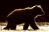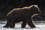 Brown bear walking on the river fishing for salmon. Sunset backlight. Brown bear chasing sockeye salmon at a river. Kamchatka brown bear: Ursus Arctos Piscator. Natural habitat. Kamchatka, Russia