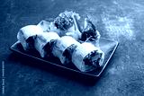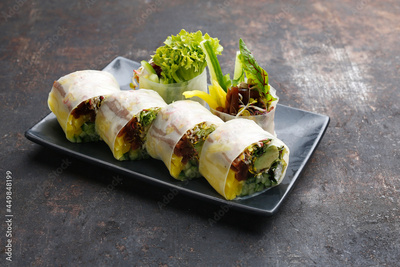 6 pieces, vegetarian fit roll, sushi maki in rice paper with fresh vegetables and Philadelphia cheese, on an oriental tray, plate, on black stony background. Japanese cuisine delicacy.