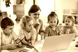 Group of small nursery school children with teacher on floor indoors in classroom, using laptop.